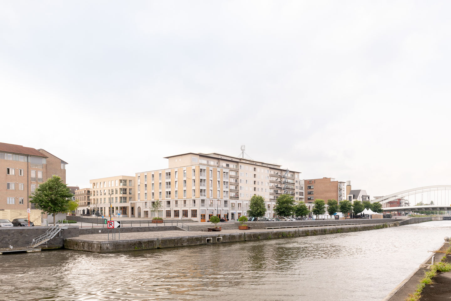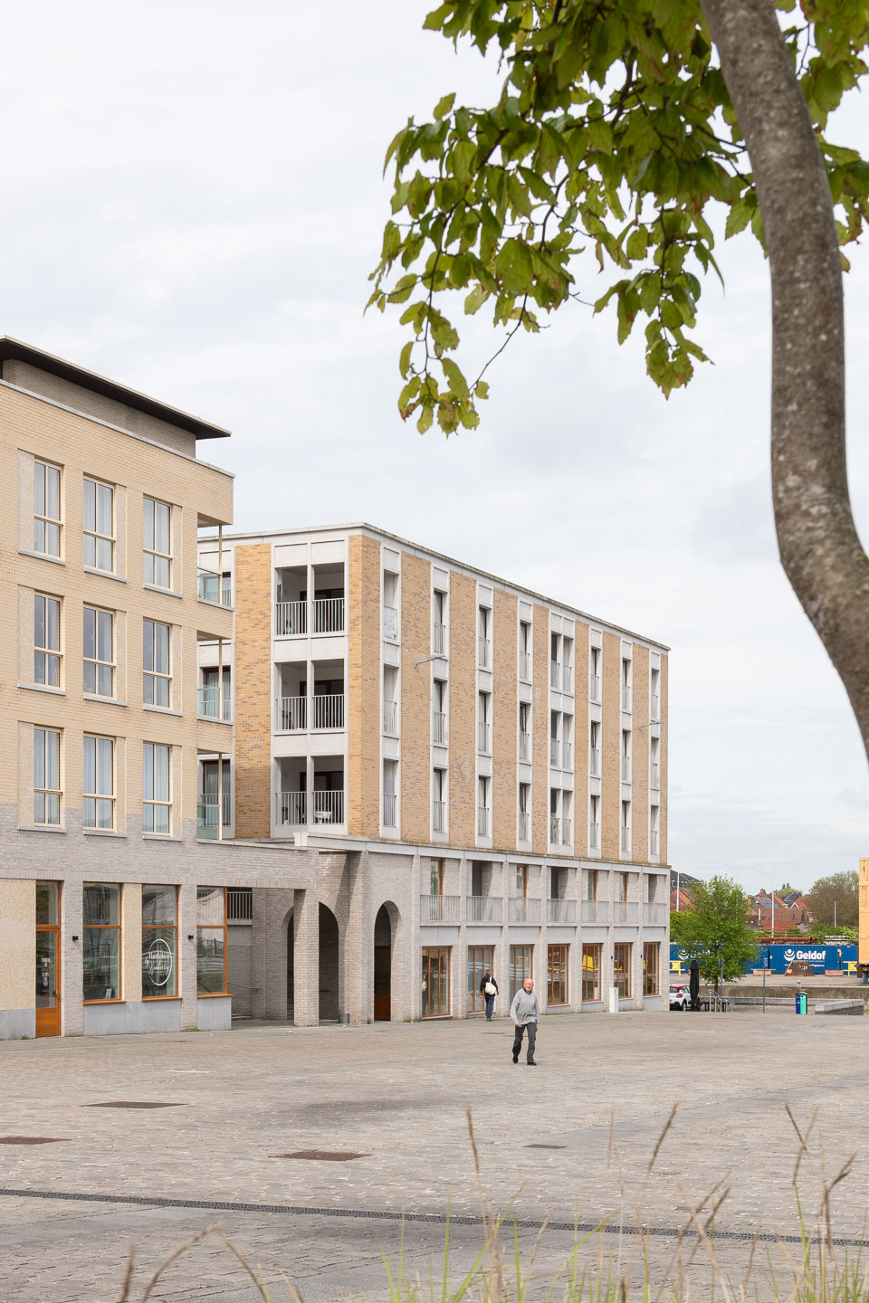 Op de hoek van de Vrijdomkaai en het nieuwe Marktplein wordt een fors gebouw van vijf bouwlagen gerealiseerd. Deze is het sluitstuk van de drie aan elkaar gekoppelde bouwblokken en situeert zich op de plek waar het niveauverschillen tussen kaai, marktplein en parkeerplein zich het sterkst aftekenen.